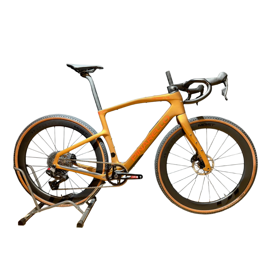 Discover the ultimate in cycling excellence with the Pinarello Grevil F5 high-end bicycle, available now at Bikeroom. The Pinarello Grevil F5 is equipped with an advanced Sram Rival AXS Xplr T-Type 1x13 groupset for smooth and efficient gear shifting, paired with top-of-the-line undefined brakes to ensure maximum control and safety on all terrains. Its expertly crafted Most Gravel Carbon 45 wheels enhance aerodynamics and reduce rolling resistance, allowing for higher speeds with less effort. Whether you're tackling steep climbs or cruising through city streets, the Pinarello Grevil F5 delivers exceptional performance and stability. This brand-new high-end bicycle also comes with the assurance of the manufacturer's warranty, so you can ride with confidence. Key Features: Groupset: Sram Rival AXS Xplr T-Type 1x13 Brakes: undefined Wheels: Most Gravel Carbon 45 Warranty: Manufacturer's warranty included Upgrade your cycling experience with the Pinarello Grevil F5, available at bike-room.com . Embrace innovation, reliability, and unparalleled performance. Visit us today and ride into the future of cycling with a bike that sets new standards in the industry.