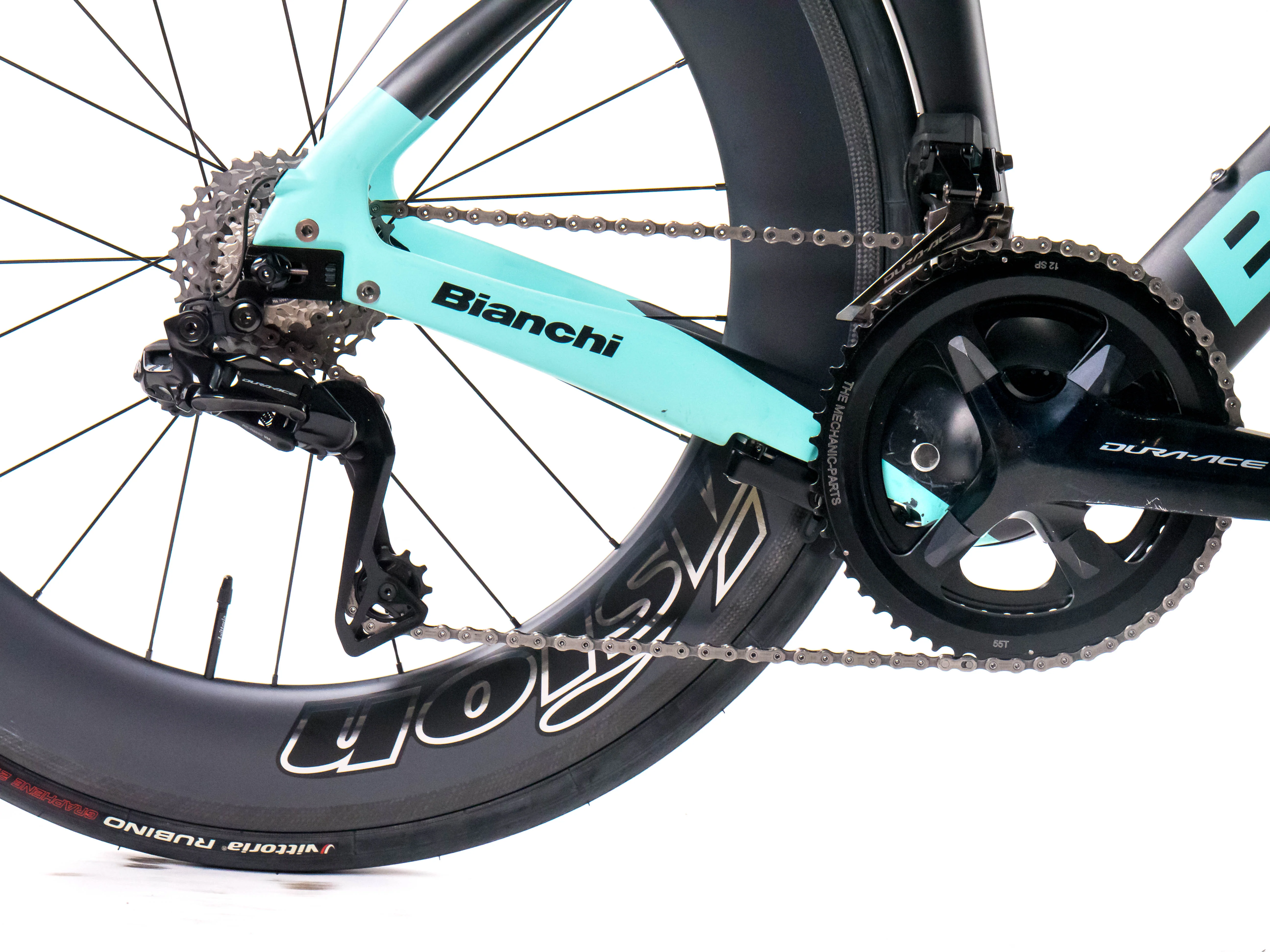 This 2024 Bianchi Aquila CV RIM, available in size XS, was ridden by FOUQUENET AMANDINE of Team Arkéa - B&B Hotels. It features a Carbon frame in great condition, a Shimano Dura-Ace Di2 2x12 groupset, and VISION METRON 80mm wheels. It has been carefully serviced by our mechanics and it is covered by a one-year Bike-room warranty (that can be extended to two years with Warranty Plus). PLEASE NOTE: This bike cannot be customized (e.g.: stem, cranks, saddle, etc.). Bike-room code: BK3268