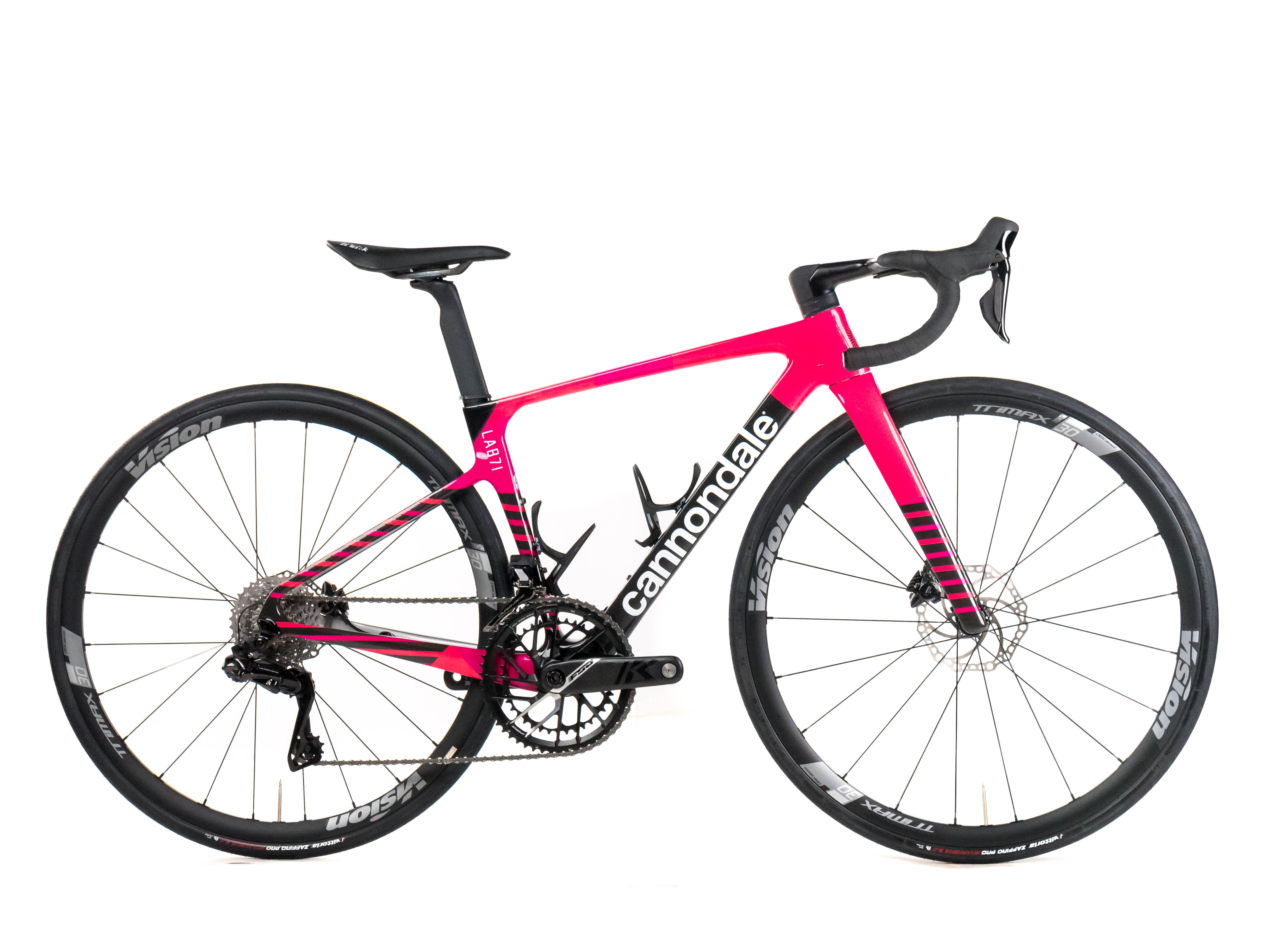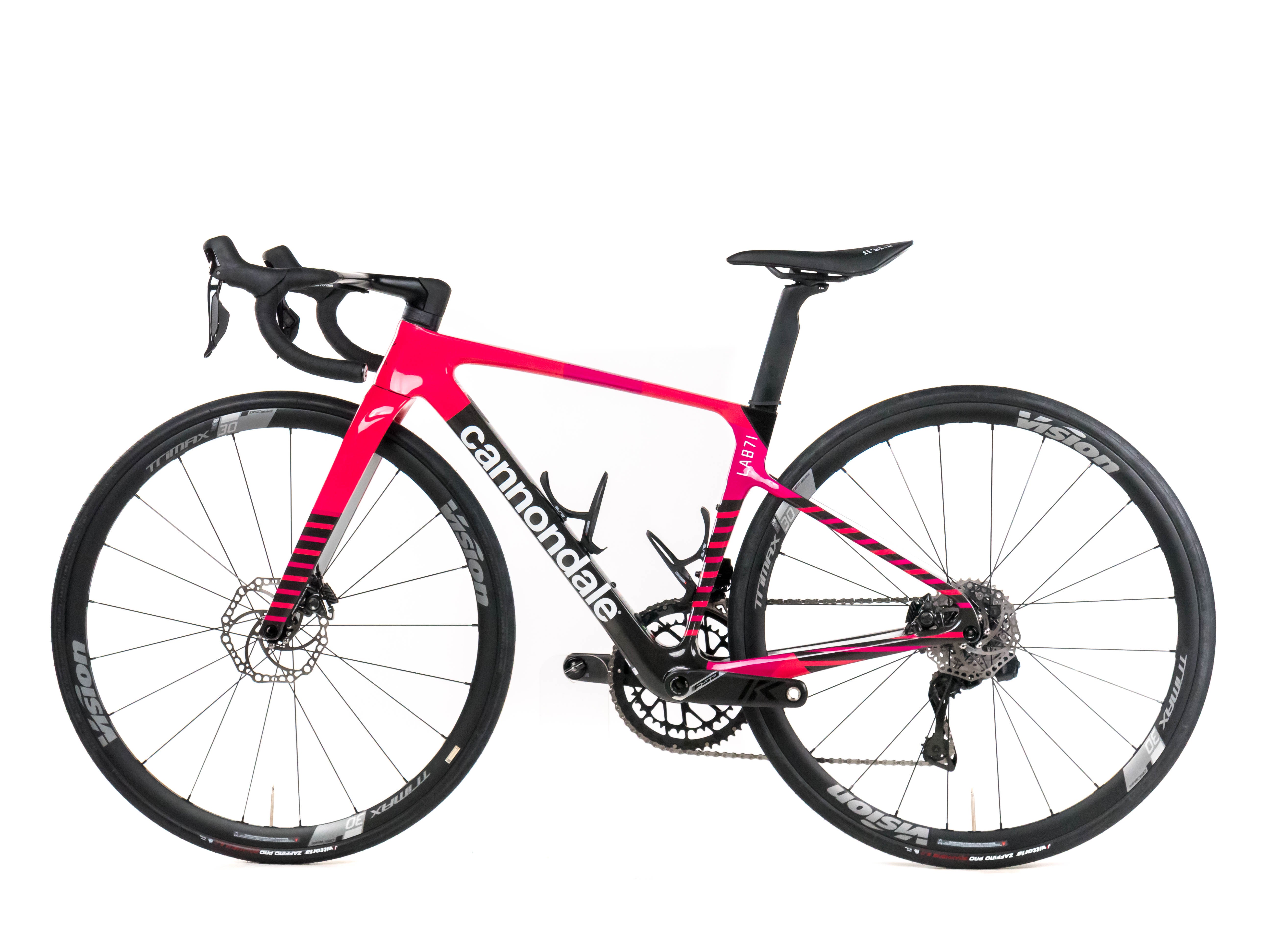 This 2025 Cannondale Supersix Evo Hi-Mod Disc, available in size 44, was ridden by a professional cyclist of Team EF Education-EasyPost. It features a Carbon frame in great condition, a Shimano Dura-Ace Di2 2x12sp groupset, and Vision Trimax 30 wheels. It has been carefully serviced by our mechanics and it is covered by a one-year Bike-room warranty (that can be extended to two years with Warranty Plus). PLEASE NOTE: This bike cannot be customized (e.g.: stem, cranks, saddle, etc.). Bike-room code: BK3627