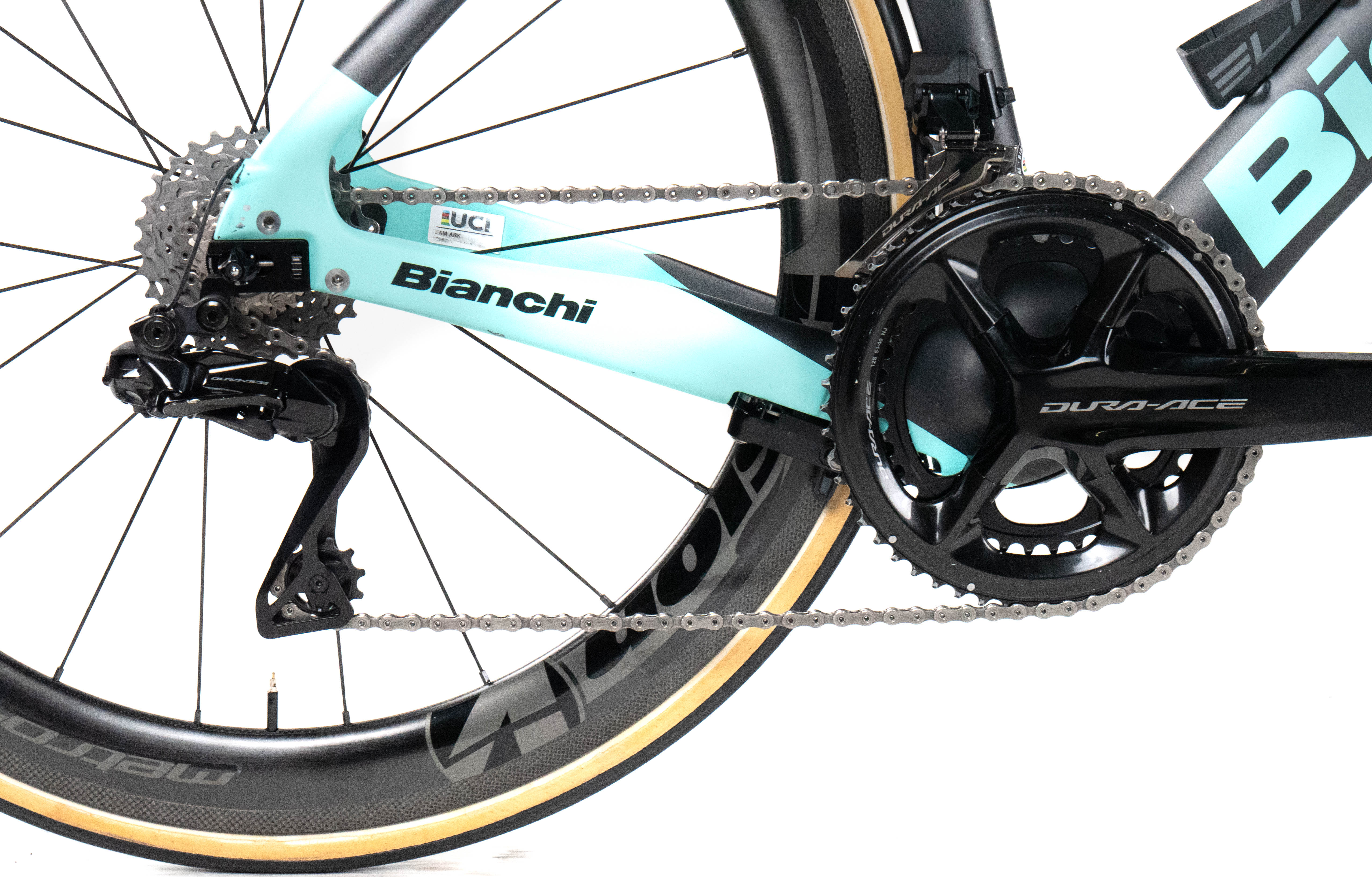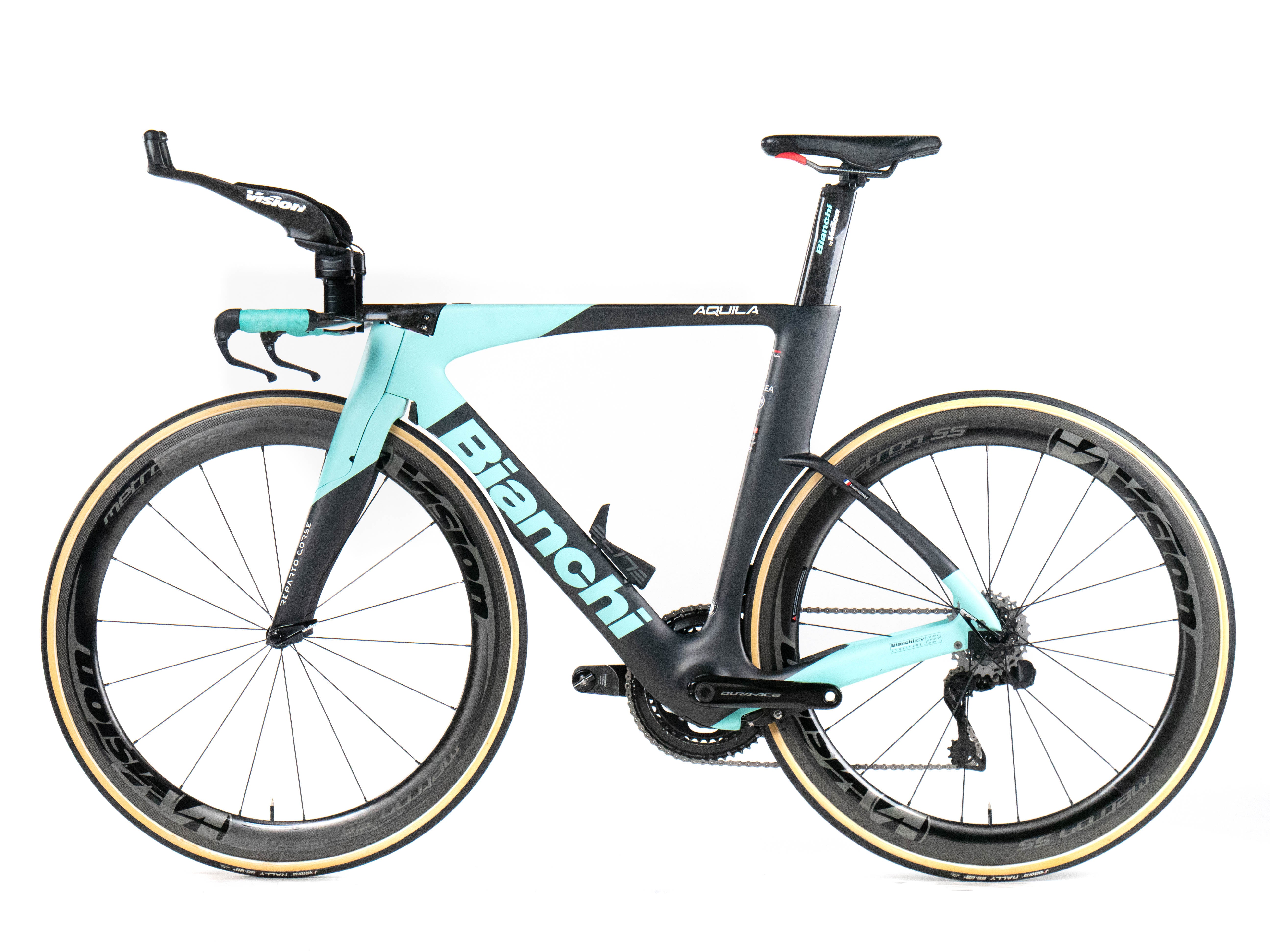 This 2024 Bianchi Aquila CV RIM, available in size S, was ridden by THIBAULT GUERNALEC of Team Arkéa - B&B Hotels. It features a Carbon frame in great condition, a Shimano Dura-Ace Di2 2x12spee groupset, and VISION METRON 55mm wheels. It has been carefully serviced by our mechanics and it is covered by a one-year Bike-room warranty (that can be extended to two years with Warranty Plus). PLEASE NOTE: This bike cannot be customized (e.g.: stem, cranks, saddle, etc.). Bike-room code: BK3395