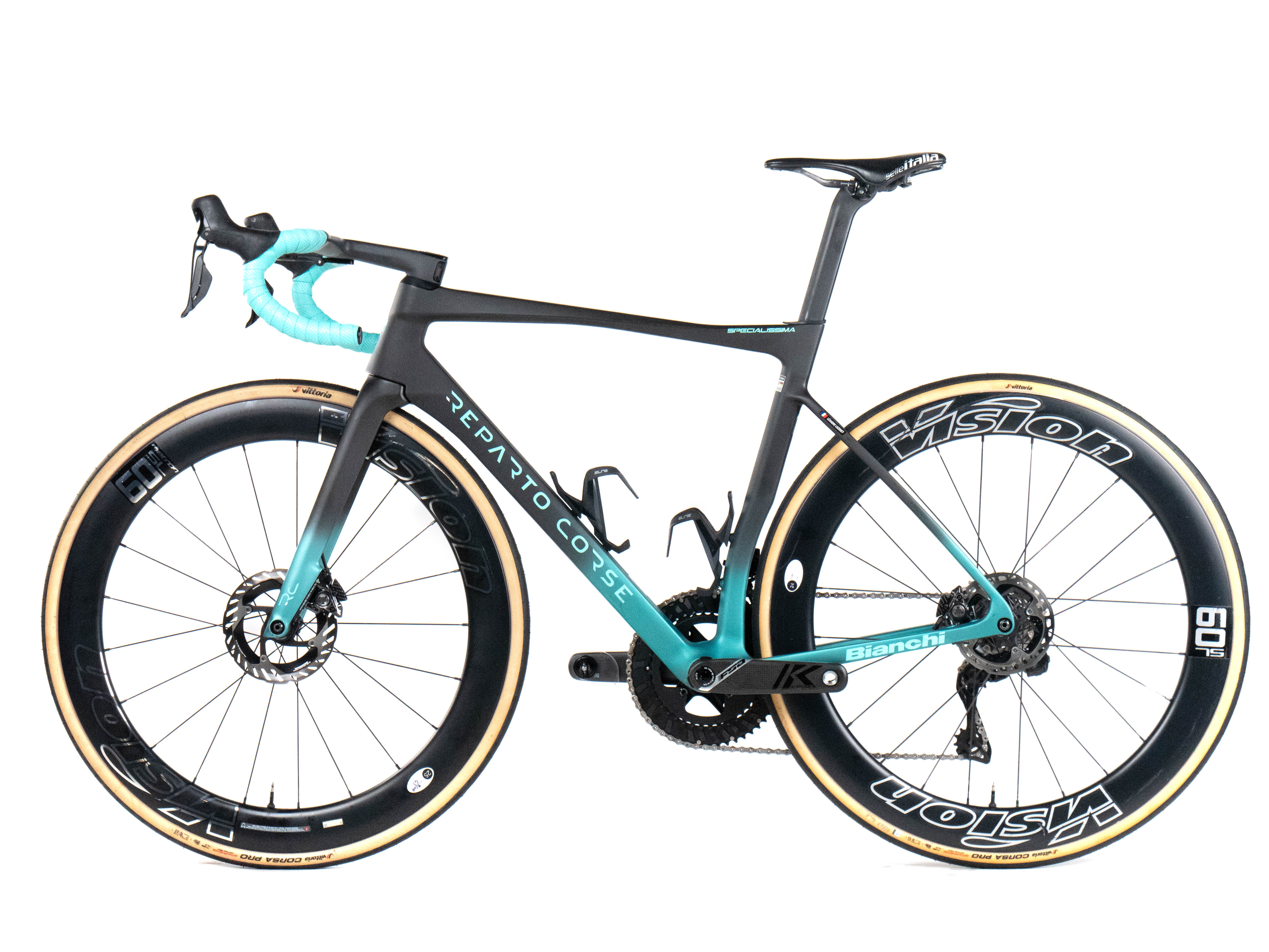 This 2025 Bianchi Specialissima RC Disc, available in size 55, was ridden by Léandre Lozouet of Team Arkéa - B&B Hotels. It features a Carbon frame in great condition, a Shimano Dura-Ace Di2 2x12sp groupset, and Vision Metron 60 SL wheels. It has been carefully serviced by our mechanics and it is covered by a one-year Bike-room warranty (that can be extended to two years with Warranty Plus). PLEASE NOTE: This bike cannot be customized (e.g.: stem, cranks, saddle, etc.). Bike-room code: BK3472